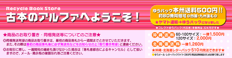 | 発送方法 | 送料は本州(四国・九州地方含む)一律500円です。 (北海道:一律1,260円/沖縄:60-100サイズ1,500円/120サイズ2,000円) 発送は入金確認後(代引きの場合は住所等のお知らせをお受けした後)当社指定の配送業者(宅配便)で発送いたします。 上記以外の発送方法(メール便、定形外、冊子小包、手渡し等)は 一切お受けできませんのでご了承ください。 ◎10kg程度までならば、複数お買い上げいただいても送料は変わりません。 ◎目安として一般的な単行本で約80冊は1梱包で発送できます。 ◎100冊未満でも20kg以上の場合は「2個口~」にて発送しますので、別途お見積もりいたします。 | |